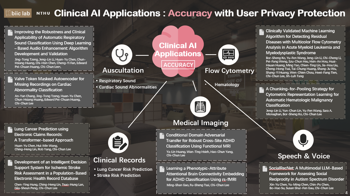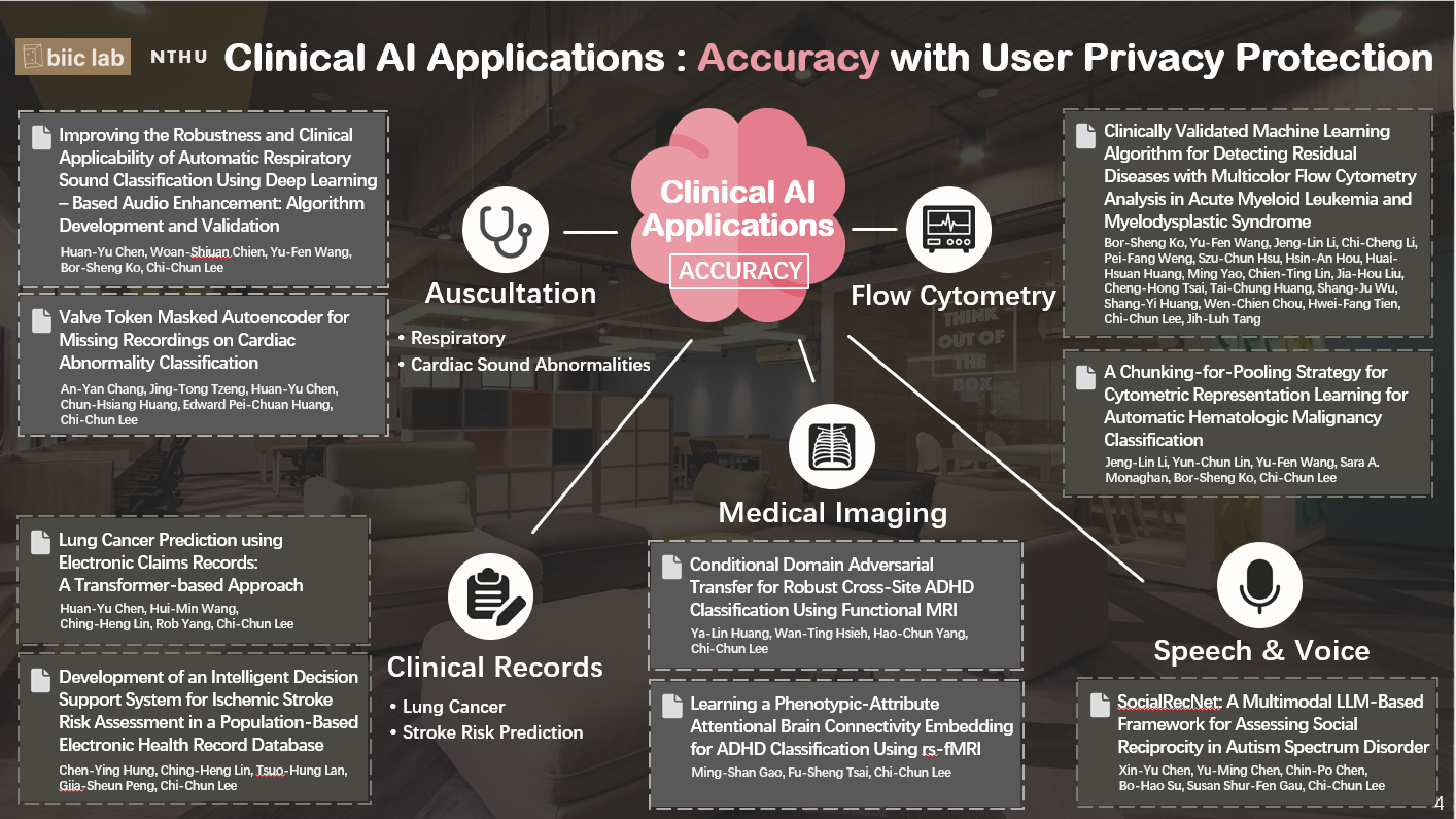臨床 AI 的應用其實比想像中還要多,也出現在各種不同型態的醫療資料與臨床情境之中。一路發展到現在,臨床 AI 技術已經相當成熟,不論是在提升診斷準確度(Accuracy),或是在保護使用者隱私(User Privacy Protection)方面。在準確度(Accuracy)提升上,我們實驗室過去有做過這五種應用的研究: