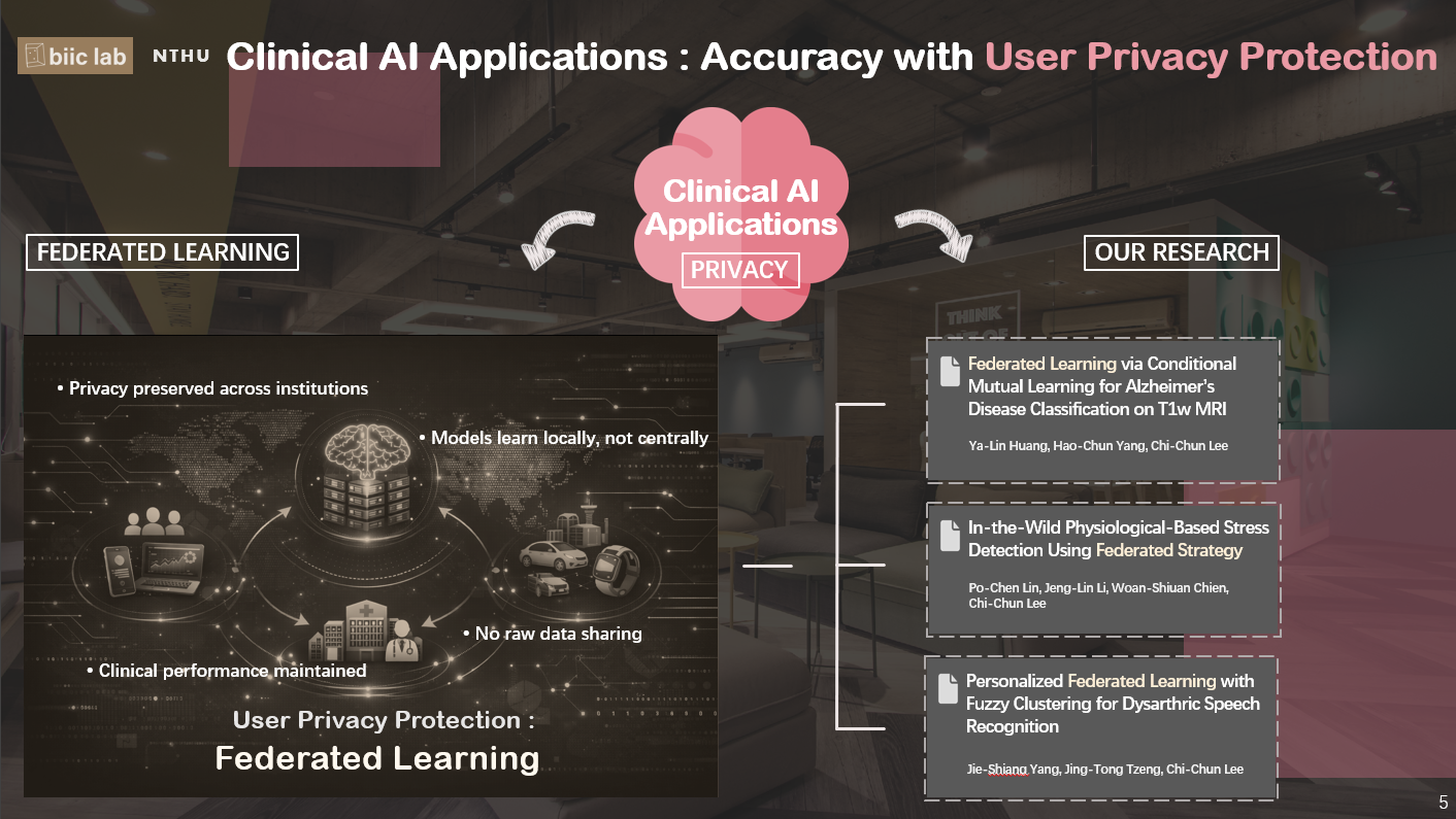 當臨床 AI 的應用越來越多時,另一個重要的問題也跟著出現:如何在使用醫療資料的同時,保護使用者的隱私,不讓使用者的個人資料被濫用或外洩。也就是說,除了模型本身表現好不好,使用者隱私保護(User Privacy Protection)也很重要。在研究使用者隱私保護(User Privacy Protection)時,我們實驗室主要用了聯邦式學習(Federated Learning)這個方法。簡單來說,聯邦式學習讓模型直接到各個資料的地方學習規律,而不用把資料集中起來。這樣一來,模型可以抓到資料的特徵,但個人資料不會被搬走或分享,自然就保護了隱私。我們實驗室就是透過聯邦式學習(Federated Learning),來研究在不同臨床情境下,如何兼顧模型表現和使用者隱私,相關研究可以參考下面這三篇論文: