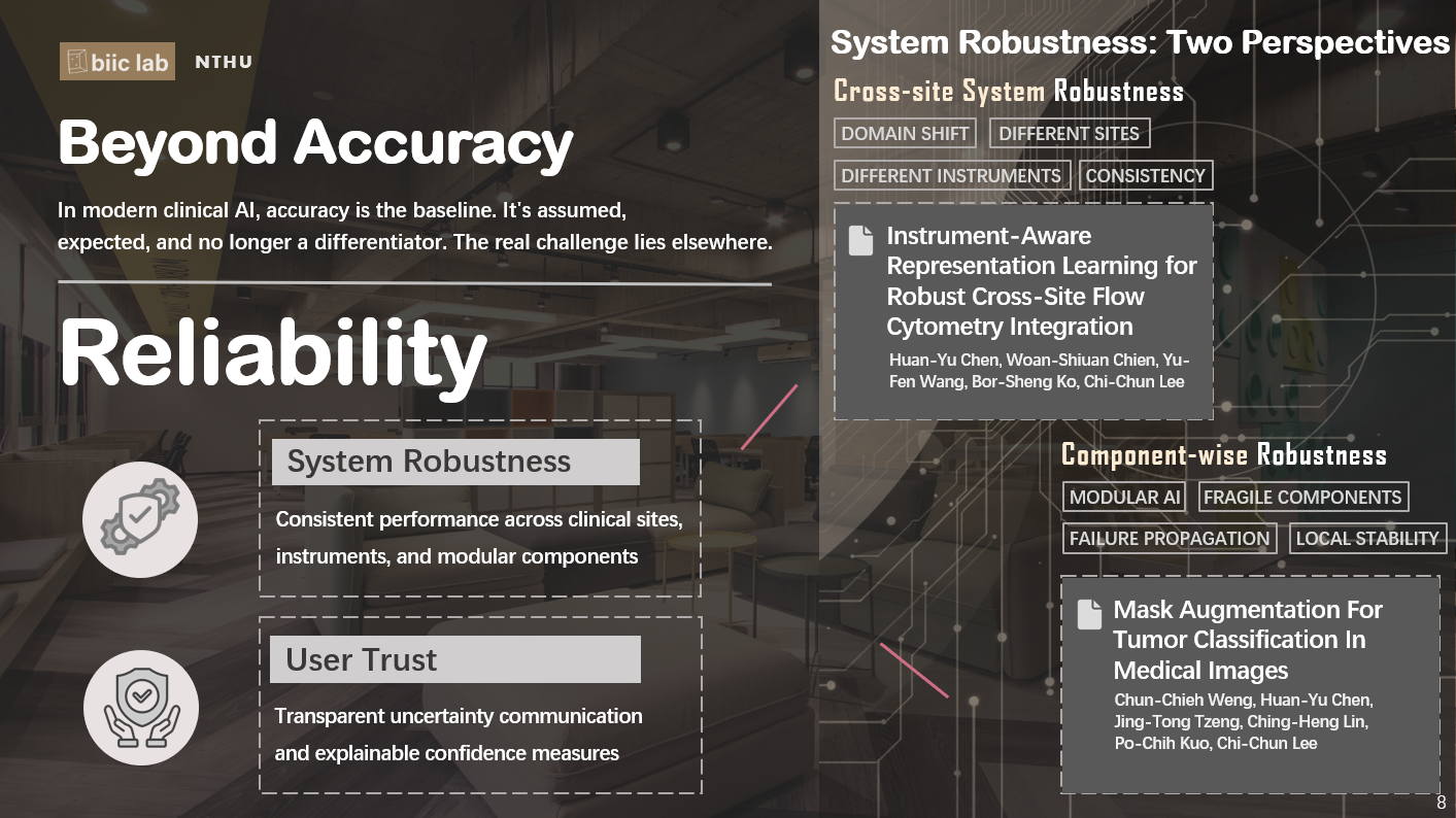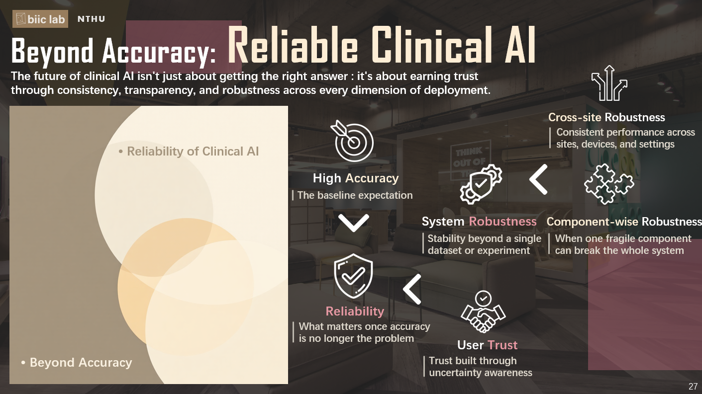 在模型已經很準確、隱私也被好好保護之後,真正的挑戰才剛開始,那就是「可靠性」(Reliability)。李祈均老師在演講中提到,AI 的可靠性其實可以從兩個面向來理解:一個是「系統強健性」(System Robustness),另一個是「使用者信任」(User Trust)。「系統強健性」(System Robustness)是在說系統在不同醫院、不同設備、甚至不同資料條件下,能不能維持一致而且穩定的表現,確保整個運作流程不會因為一點改變就出問題。「使用者信任」(User Trust)指的是 AI 不只給一個是或不是的結果,而是讓使用者知道更多判斷背後的資訊,讓使用者更能理解模型的判斷,也更能相信它的結果。