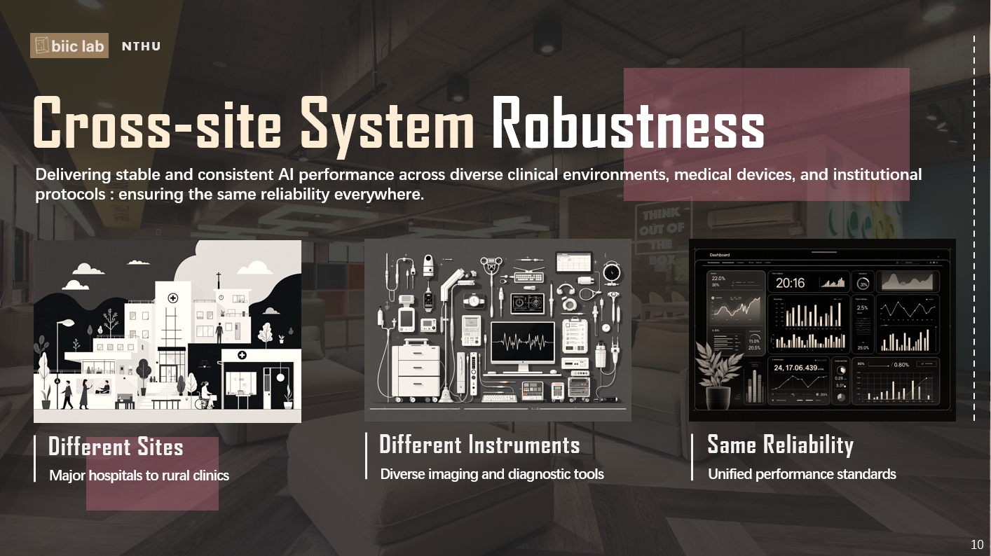 在醫療 AI 的實際應用中,很常會遇到一個問題:同一套模型,放在不同醫院、不同臨床環境下,表現卻不一定一樣。不同的設備型號、量測方式,甚至各院的操作流程,都可能讓模型接收到的資料長得不一樣。對 AI 來說,這些看似細微的差異,很容易影響判斷結果。跨場域系統強健性(Cross-site System Robustness),講的就是模型能不能在這些不同情境下,依然維持一致、穩定的表現,而不是只在特定場域特別準。針對這個問題,我們實驗室研究出「Instrument-Aware」的學習方法,讓模型在訓練過程中分辨哪些特徵真的和疾病有關,哪些只是來自不同儀器或設備造成的差異,使系統在不同醫療機構之間切換時,仍能保持穩定的表現。