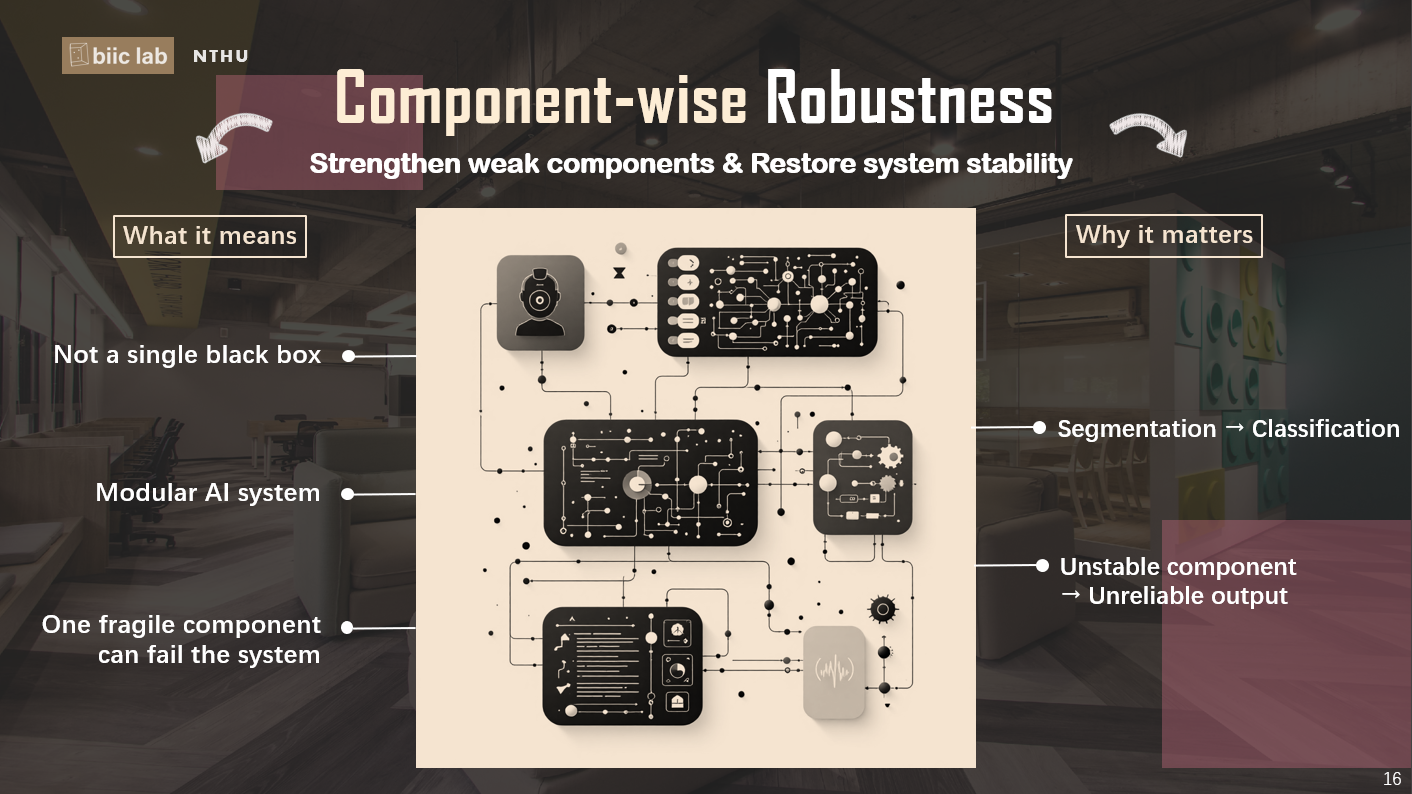 一個臨床 AI 系統其實不是單一模型在運作,而是由很多「小組件」串起來完成判斷。像是前面先做影像分割,接著再進行分類,只要其中一個環節不穩定,後面的結果就很容易跟著失準。這也是為什麼 Component-wise Robustness 很重要!在這部分,我們實驗室的做法是直接針對容易出問題的環節下手,透過像是 Mask Augmentation 的技術,讓模型在訓練時就先遇過資訊不完整或影像受損的狀況,學會怎麼應對。當每個小組件都更穩定,整個 AI 系統在實際臨床使用時,表現自然也就更可靠。