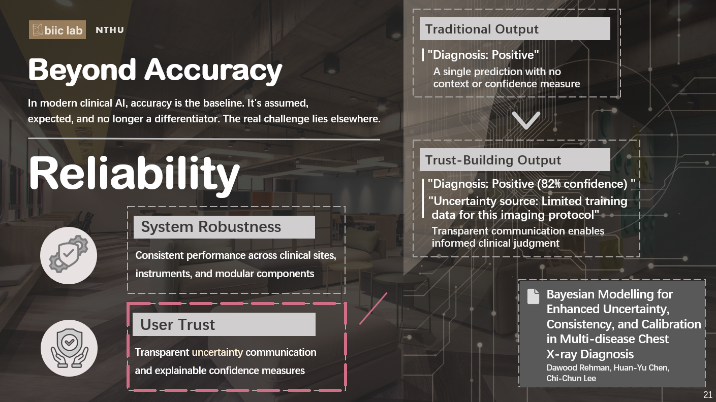 現在,我們正在推動一場從「答案導向」到「信心導向」的轉型。意思是,AI 不只告訴你「是或不是」,而是會說清楚它有多確定。這是我們實驗室正在進行的研究方向之一,透過貝式建模(Bayesian modelling),讓 AI 在給出診斷結果的同時,也能標註它的信心程度。例如,AI 會告訴醫師:「我覺得有 85% 的機率是肺炎,但因為這張影像有點模糊,我的不確定性來自於雜訊干擾。」有了這種透明的信心資訊,醫師就能更安心地判斷,哪些結果可以參考、哪些需要再多看一眼。