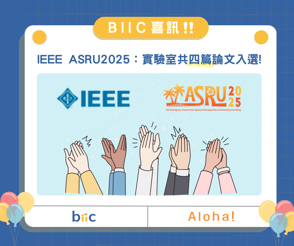 今年的 ASRU 將於12/6-12/10在夏威夷舉行,恭喜傑翔、亞澤、敬涵、Shreya,很高興能在大會上分享我們的研究,也很期待與大家的交流,祝你們開會順利!